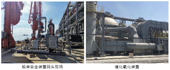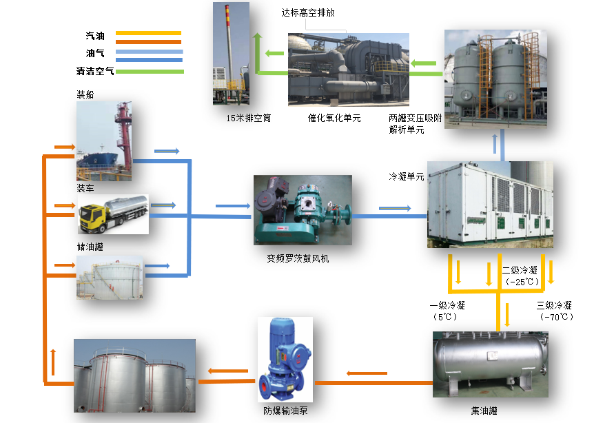 在產(chǎn)品罐區(qū)及碼頭裝船區(qū),油氣經(jīng)過“收集-輸送-冷凝(吸收)-催化氧化”等工藝處理,最終達標排放。