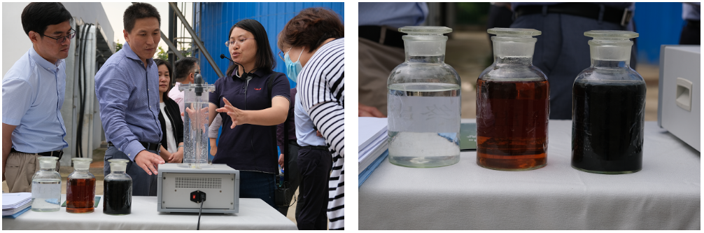 隨后水辦一行領導對“填埋場滲濾液低耗穩定資源化利用技術提升研究與工程示范”進行檢查,子課題二技術骨干韓穎就示范工程情況進行匯報,并展示噴射環流反應器模型、滲濾液進水、MBR出水、RO出水,得到一眾領導的認可。